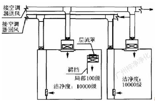 此方式的缺點是設置循環風機箱及處理噪聲,需要較大的空間,而通常百級區周圍風管都比較密集,需要精心布局。此方式百級區上部靜 壓箱相對百級區室內為正壓,頂棚高效過濾器與吊架間的滲漏,為靜壓箱流向室內,直接影響百級區潔凈度。對施工質量要求較高。(具 體可參考: