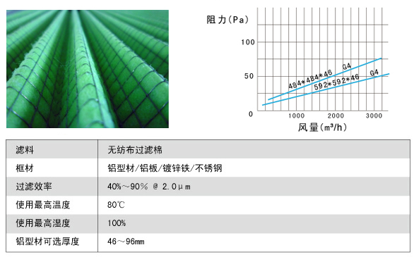 過濾效率:G1:40%@5.0μm、G2:65%@5.0μm、G3:85%@5.0μm、G4:90%@5.0μm(計重法);
